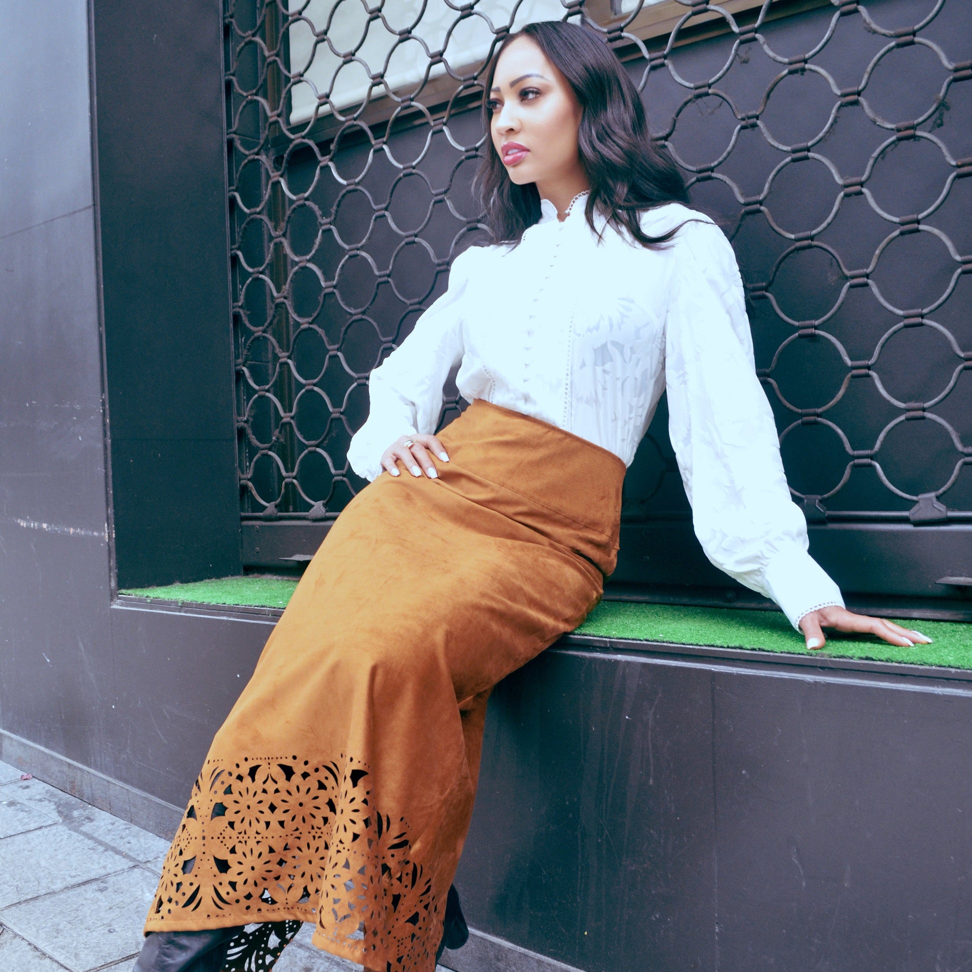 Su diseño se basa en la delicada polipiel , con botones en la parte delantera y mangas voluminosas con tachuelas ajustadas, creando una silueta elegante y femenina. Ideal para combinar con faldas, pantalones de cuero o prendas de ante, como en la foto.